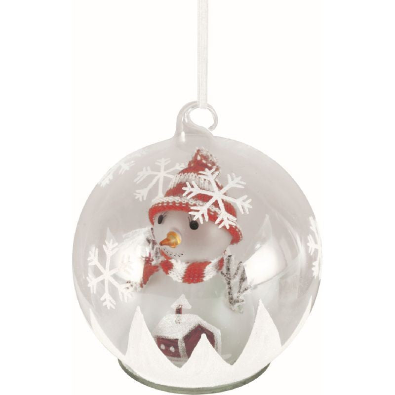 Glob confectionat din sticla pentru decorul Bradului de Craciun, acesta dispune de un LED muticolor ce isi schimba culoarea (LED RGB) si de o figurina in forma de Om de Zapada.