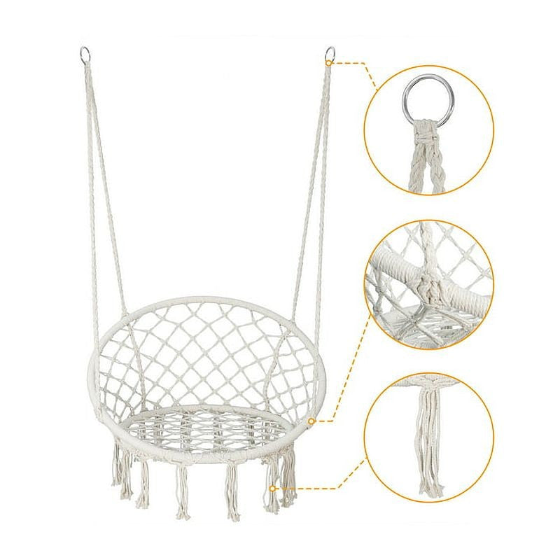Este realizat dintr-o impletitura rezistenta si franjuri decorativi, fiind confectionat din bumbac si un amestec de poliester. Pentru un plus de confort puteti aseza cateva perne decorative pe spatarul hamacului si o patura pufoasa.