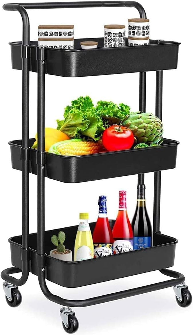 Raft depozitare cu 3 cosuri, roti pivotante, structura metalica, ABS, 45x35x84 cm, negru