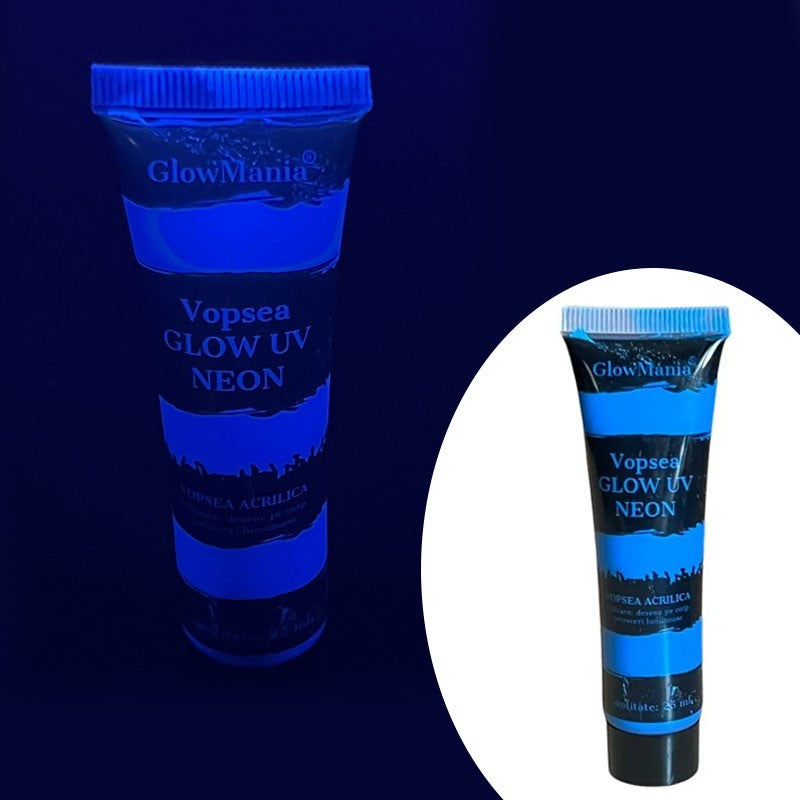 Vopsea glow UV albastru neon, formula non-toxica, pentru body painting, recipient 25 ml