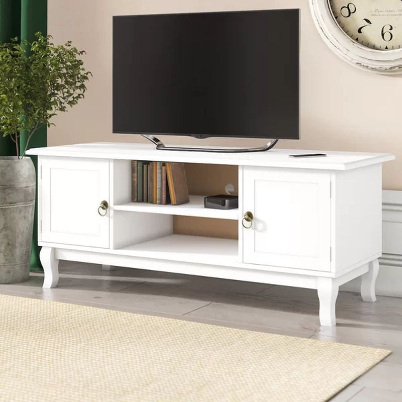 Comoda TV 120x40x50 cm, rafturi, 2 dulapuri depozitare, picioare lemn pin, MDF, alb