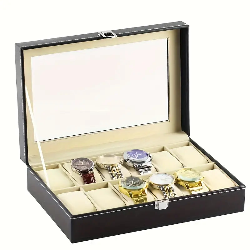 Aceasta cutie eleganta pentru depozitarea ceasurilor este perfecta pentru iubitorii de ceasuri care doresc sa-si pastreze colectia intr-un spatiu organizat si protejat. Cu un design sofisticat si modern, cutia are 12 compartimente individuale, suficient de spatioase pentru a gazdui ceasuri de diverse dimensiuni si modele. Realizata din piele ecologica neagra, aceasta adauga o nota de rafinament si lux decorului oricarei camere, fiind in acelasi timp durabila si usor de intretinut.