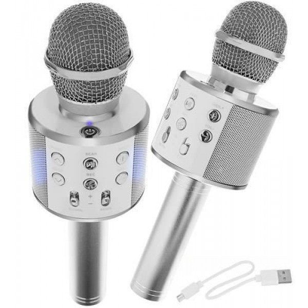 Microfon Karaoke Bluetooth cu Boxa incorporata si USB - ArgintiuMULTI FUNCTIONAL - un microfon cu doua difuzoare, va permite sa ascultati si sa inregistrati melodii se conecteaza la dispozitive externe (de exemplu, telefon, tableta, SMART TV cu sistem de operare ANDROID sau IOS) prin Bluetooth 4.0 sau prin cablul inclus.