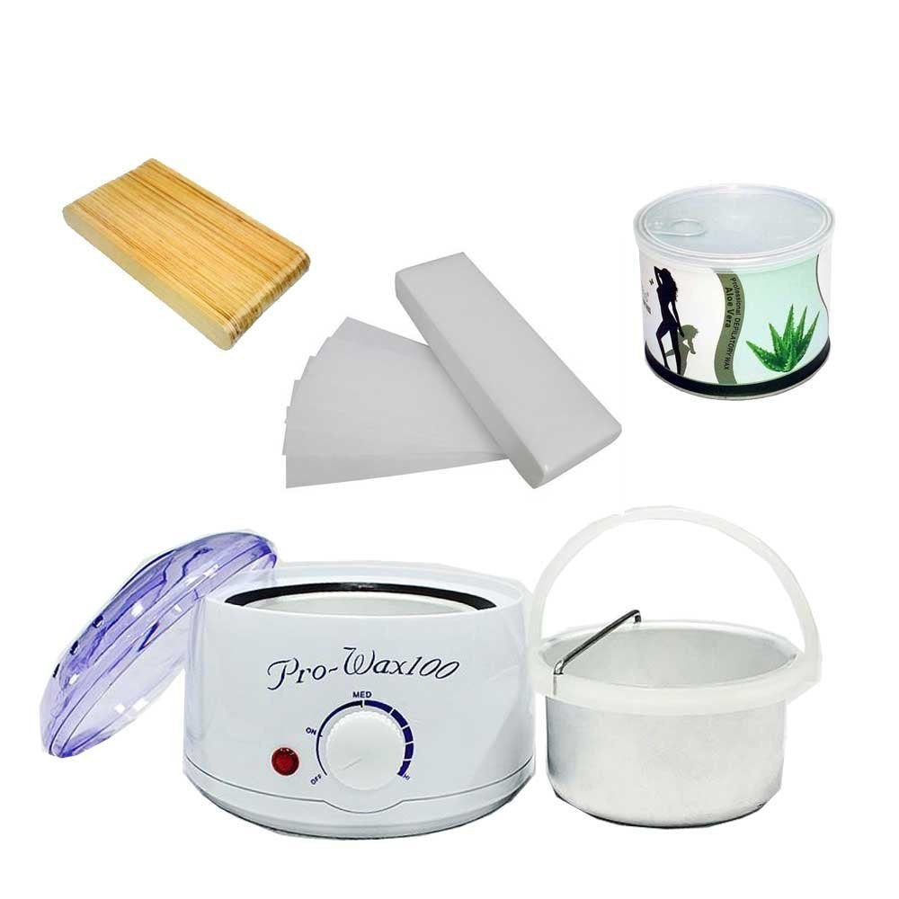 Kit-ul de epilare cuprinde un incalzitor electric pentru ceara, o cutie de 500 g cu ceara pentru epilare, 10 spatule din lemn pentru aplicarea cerii epilatoare si 50 benzi pentru indepartarea cerii.