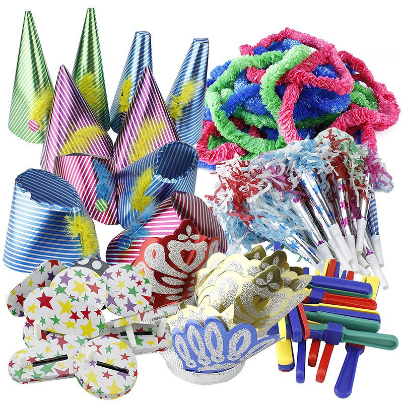 Distractia va fi la cote maxime cu acest set de petrecere compus din 80 piese pline de culoare. Setul contine 7 tipuri de accesorii si anume: coifuri, palarii, coronite, castaniete, zornaitori, suflatori cu franjuri si ghirlande.
