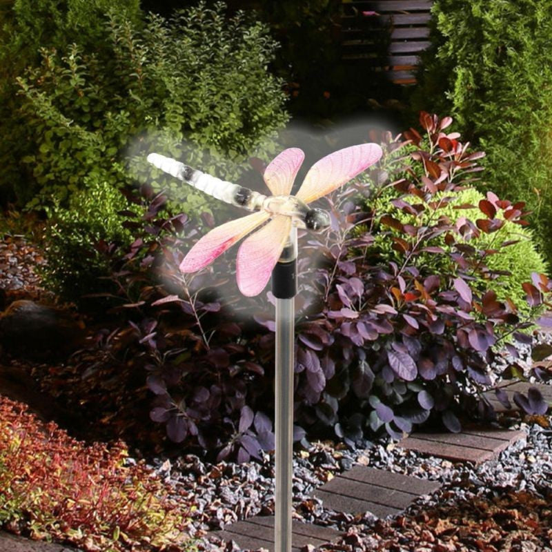 Decoratiune solara libelula roz, LED alb rece, suport fix, inaltime 50 cm