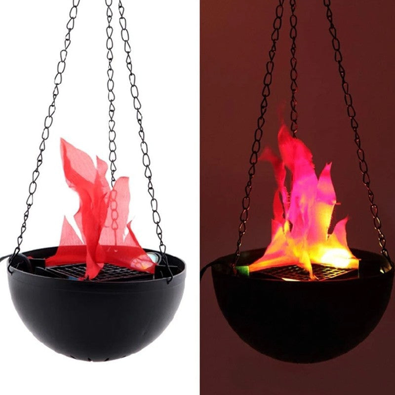 Lampa suspendata este prevazuta cu o flacara din tesatura taiata si este asezata intr-un bol de metal negru suspendat cu ajutorul unor lanturi. Lampa emita flacarile unui foc real prin simpla conectare la o priza standard cu ajutorul cablului de alimentare inclus. Este potrivita atat pentru acasa, hoteluri, restaurant, cluburi cat si pentru petreceri de Halloween.