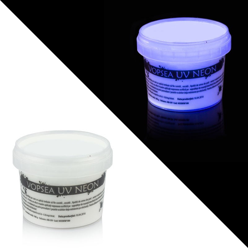 Vopseaua UV neon alba este o vopsea speciala sensibila la lumina UV, ingloband pigmenti fluorescenti care prin proprietatile lor elibereaza lumina in culoarea alba atunci cand este expusa in lumina UV, fiind de culoare alba chiar si la lumina normala a zilei.