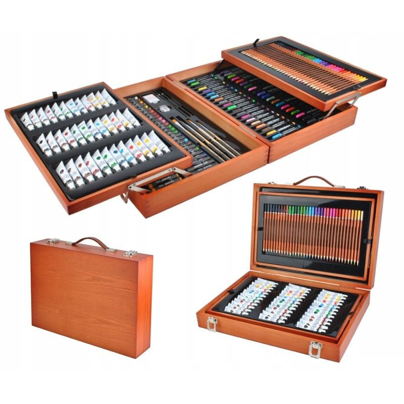 Trusa pictura si desen 174 piese, creioane, vopsea, pensule, markere, valiza lemn
