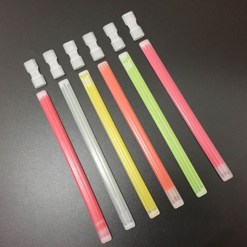 Fiecare betisor cu grosimea de 5 mm si lungimea de 20 cm dispune de un conector cu ajutorul caruia se contruiesc bratarile luminoase de acest fel.