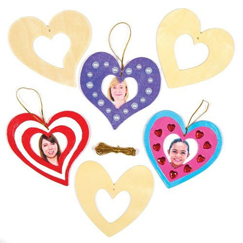 Decoreaza aceste rame foto din lemn in forma de inima folosind vopsea acrilica, creioane, markere, sclipici, autocolante, etc.