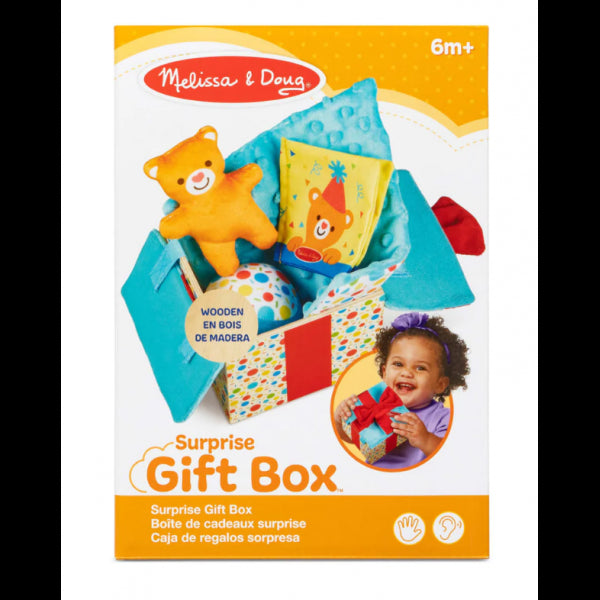 Jucaria din 5 piese pentru sugari include cutia de lemn, urs de plus, minge care zangane, panza plina cu textura multipla si o carte din panza.