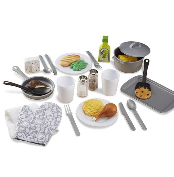 Setul include 22 piese realizate din plastic rezistent: un vas cu capac, tigaie, fursec, spatula, paleta, doua farfurii, doua cupe, doua furculite, doua cutite, doua linguri si un cronometru.