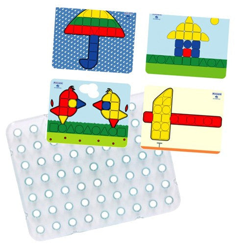 Setul include 64 de piese de mozaic mari in 4 culori primare: rosu, verde, albastru si galben.