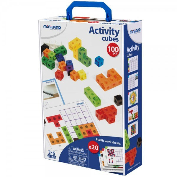 Setul include: 100 cuburi de 2 cm in 10 culori, 20 carduri cu activitati, ambalat in cutie prevazuta cu maner.