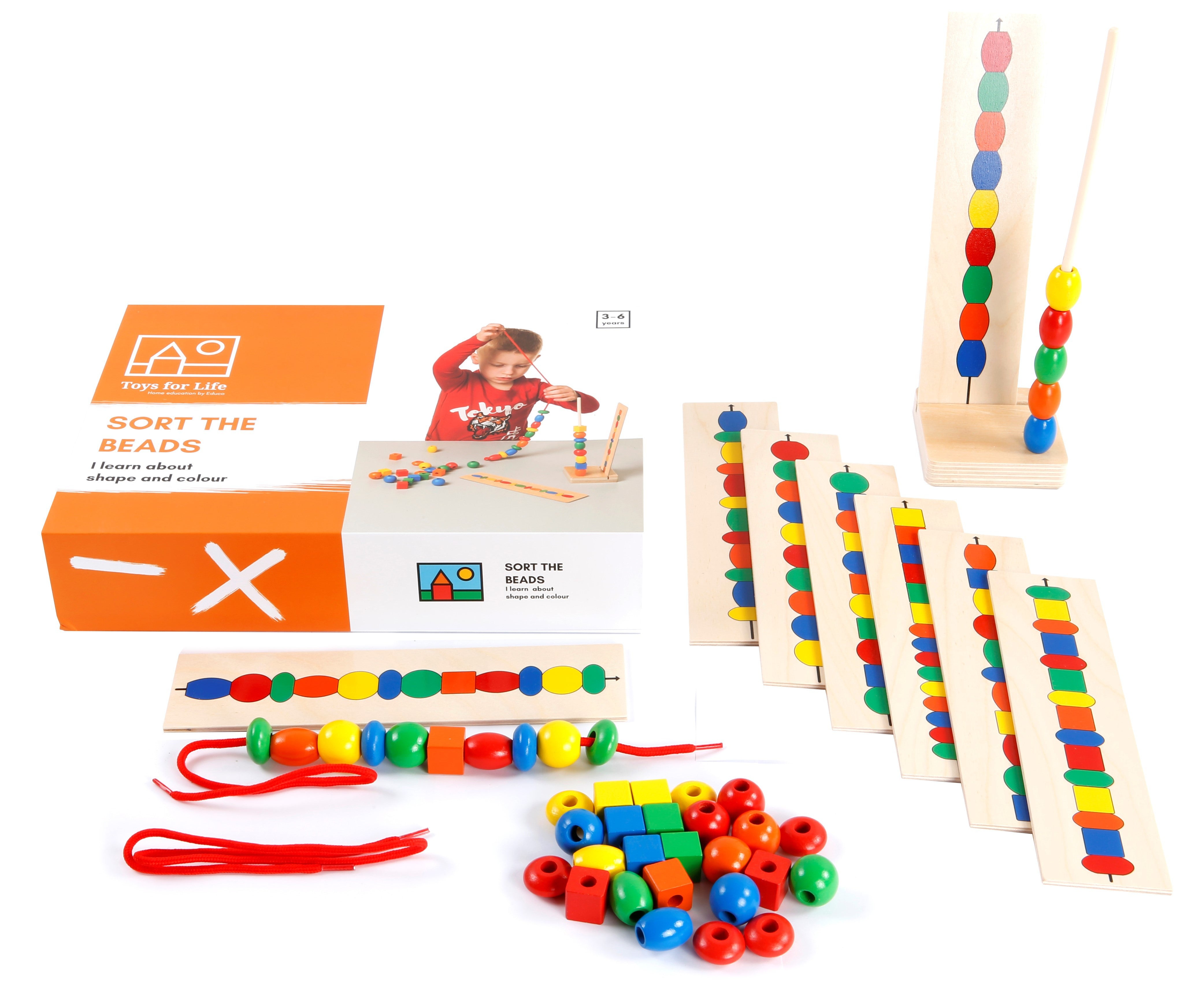 - 40 de margele de lemn in 5 culori diferite si 4 forme