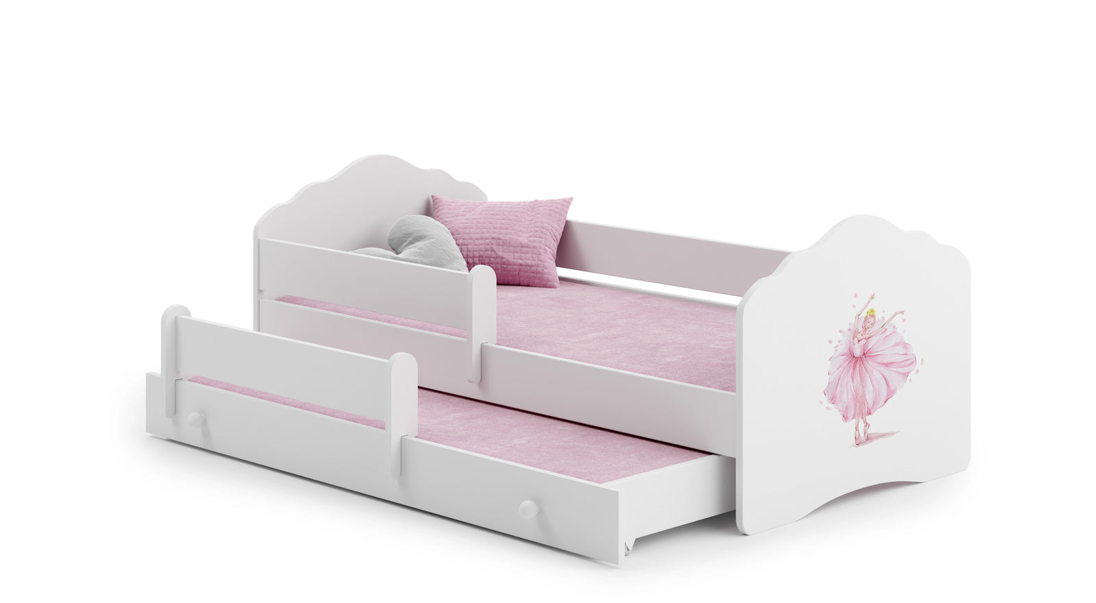 Patul FALA II asigura siguranta maxima datorita marginilor rotunjite si sinelor de siguranta detasabile, care impiedica copilul sa cada in timp ce doarme. Fabricat din materiale certificate, se caracterizeaza prin durabilitate si productie ecologica. Patul alb cu grafica pentru copii aduce o atmosfera vesela si de basm in camera, ceea ce va face timpul pentru joaca si odihna mai placut. Imprimeul nu este doar placut ochiului, ci imbogateste si spatiul, facand din patul un element decorativ unic. Constructia robusta a placii de mobilier si cadrul FLEX asigura un somn confortabil, iar doua saltele si rame sunt incluse pentru confortul de zi cu zi. Patul este usor de asamblat cu instructiunile incluse, iar durabilitatea lui inseamna ca va rezista multi ani.