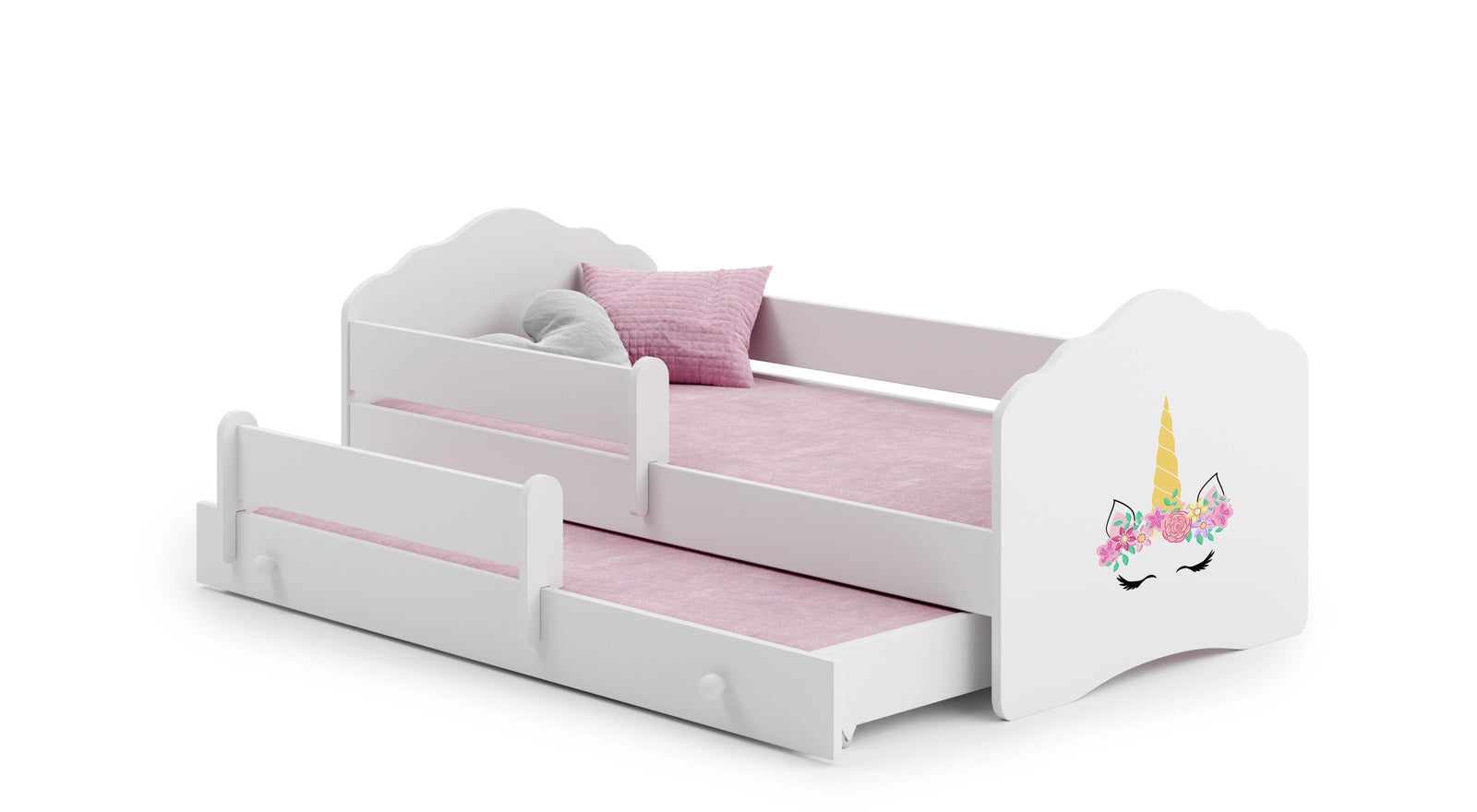 Patul FALA II asigura siguranta maxima datorita marginilor rotunjite si sinelor de siguranta detasabile, care impiedica copilul sa cada in timp ce doarme. Fabricat din materiale certificate, se caracterizeaza prin durabilitate si productie ecologica. Patul alb cu grafica pentru copii aduce o atmosfera vesela si de basm in camera, ceea ce va face timpul pentru joaca si odihna mai placut. Imprimeul nu este doar placut ochiului, ci imbogateste si spatiul, facand din patul un element decorativ unic. Constructia robusta a placii de mobilier si cadrul FLEX asigura un somn confortabil, iar doua saltele si rame sunt incluse pentru confortul de zi cu zi. Patul este usor de asamblat cu instructiunile incluse, iar durabilitatea lui inseamna ca va rezista multi ani.